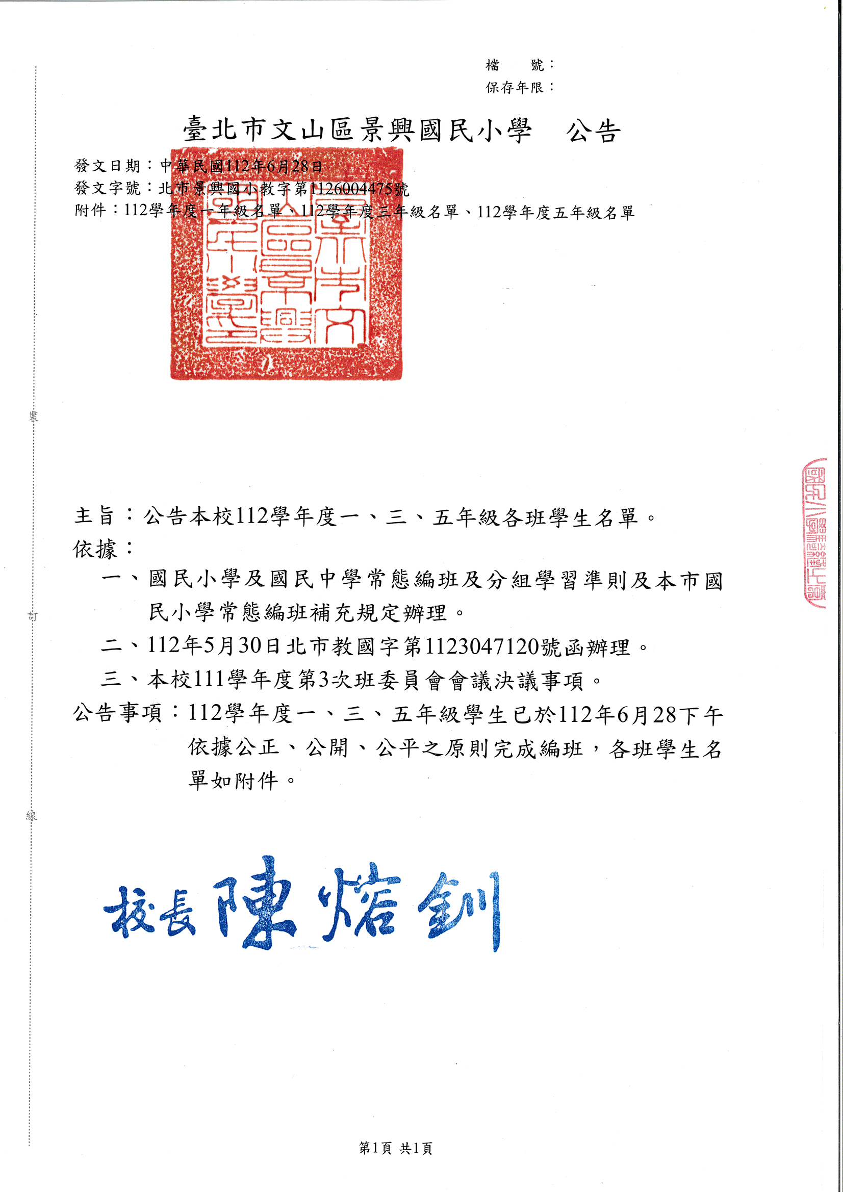 公告事項:本校112學年度一、三、五年級編班依112年6月21日校內編班委員會決議事項,於112年6月28日下午完成公開編班作業,學生名單如附件。