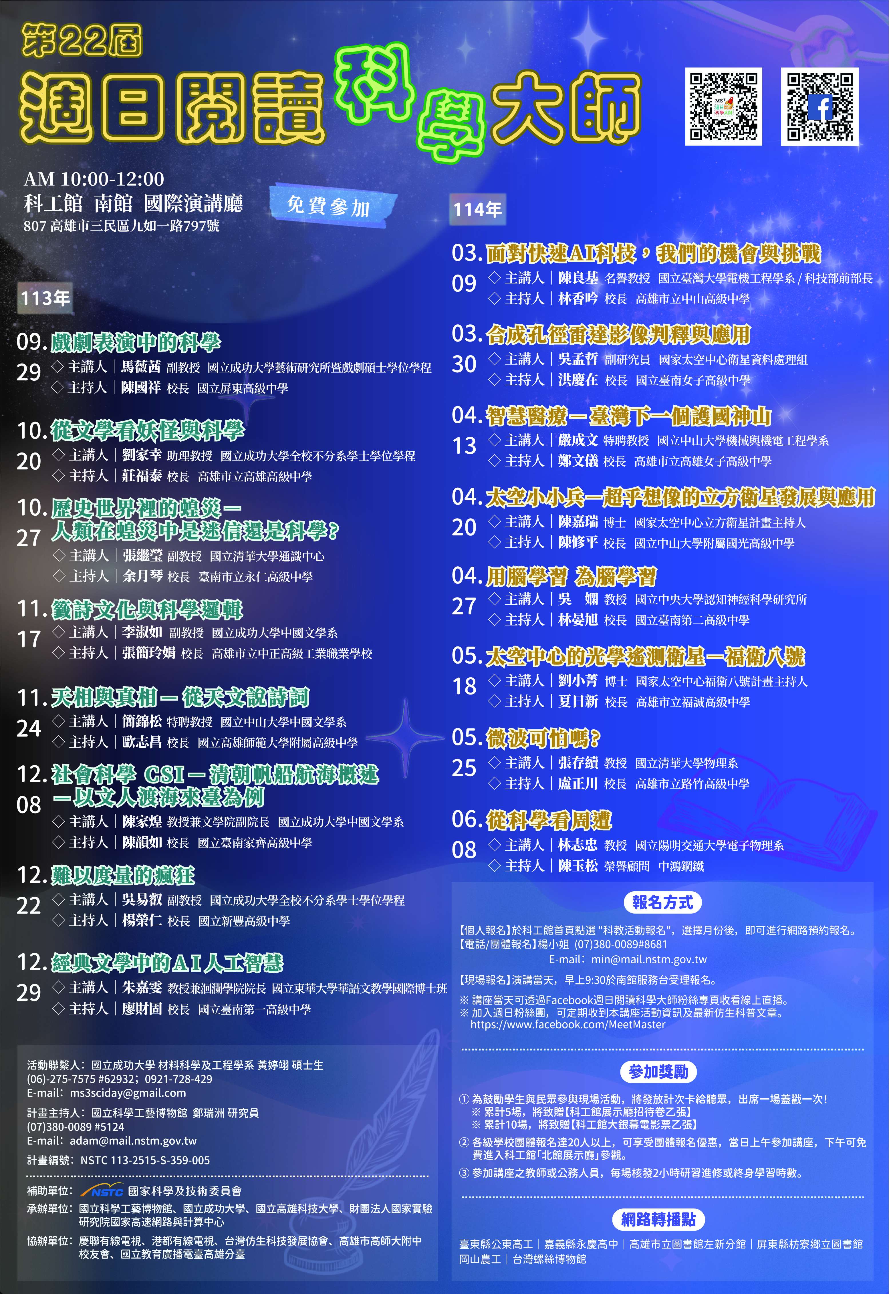 主旨:轉知國立科學工藝博物館辦理「第22屆週日閱讀科學大師」系列科普講座場次表及海報各1份,請貴校公告並鼓 勵師生踴躍報名參加,請查照。