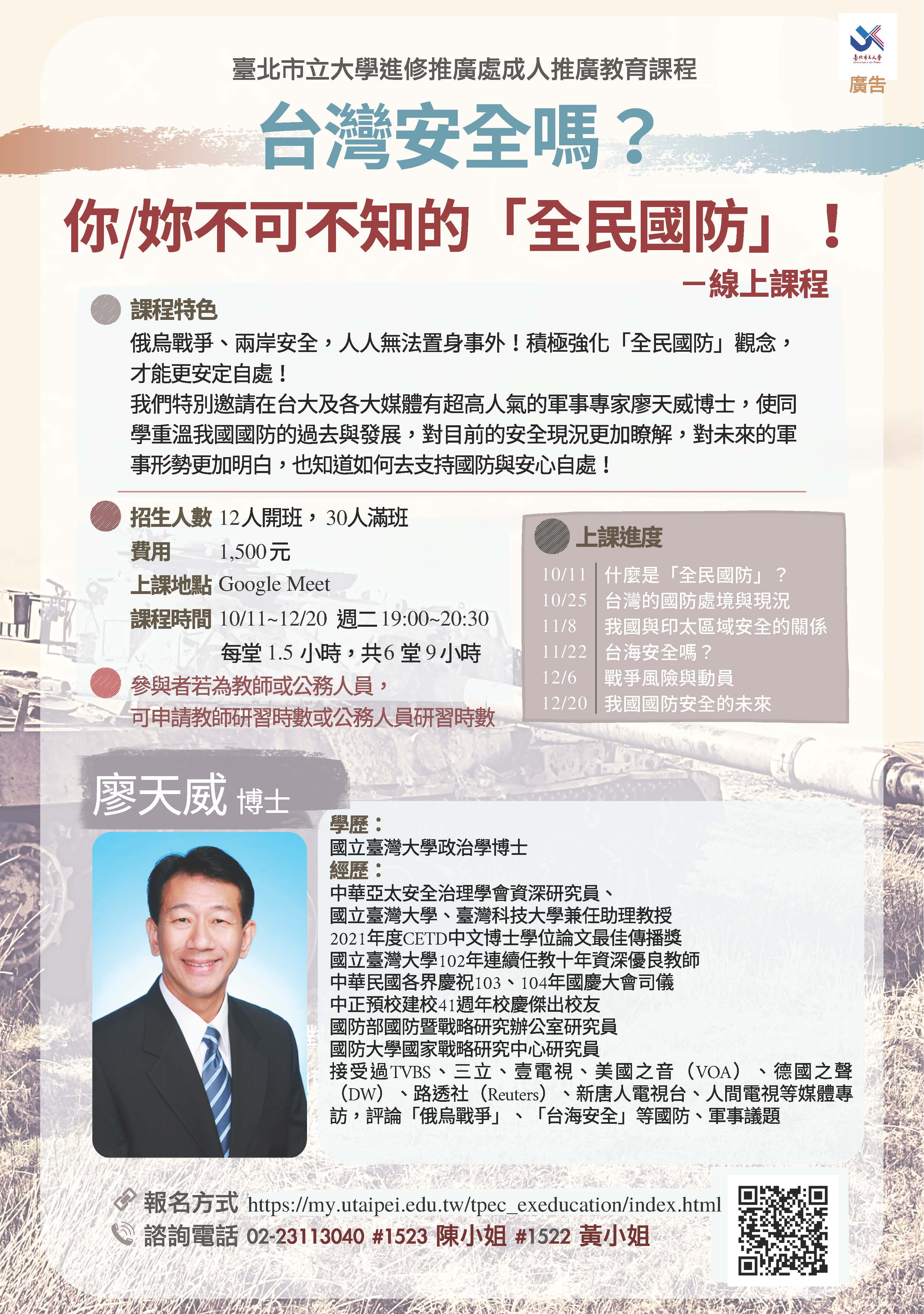 (一)課程簡介:俄烏戰爭、兩岸安全,人人無法置身事外!積 極強化「全民國防」觀念,才能更安定自處!