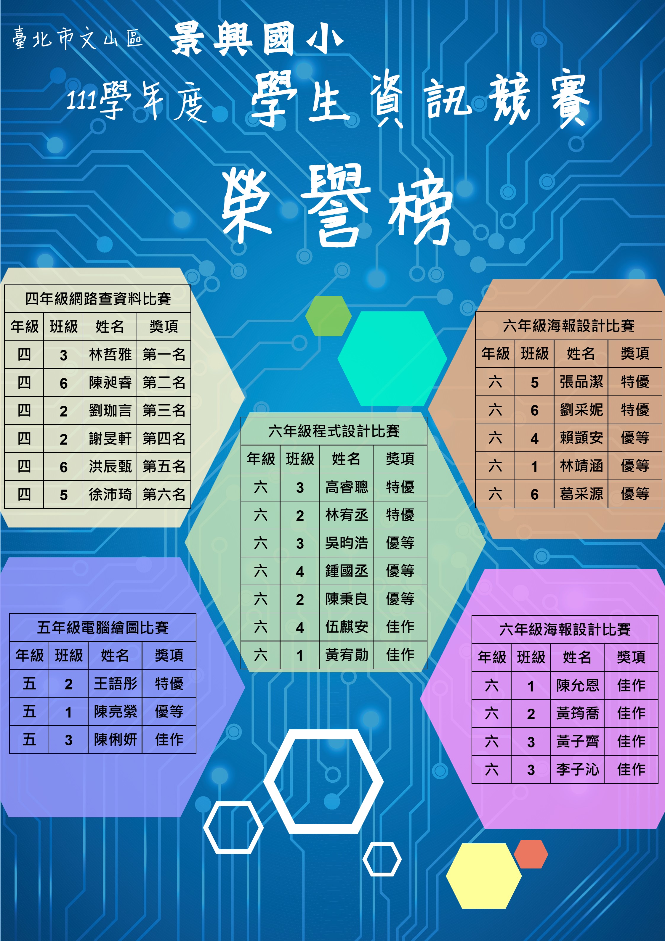 公告111學年度學生資訊競賽-(網查、電繪、程設、海報)比賽榮譽榜,恭喜得獎同學!