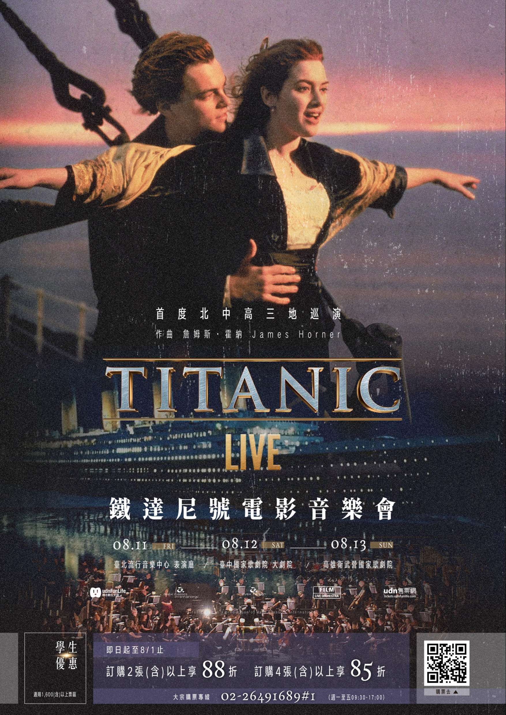聯合數位文創訂於112年8月11日(五)起至112年8月13日(日) 於臺北流行音樂中心表演廳、臺中國家歌劇院大劇院、高 雄衛武營國家歌劇院舉辦《鐵達尼號電影音樂會》