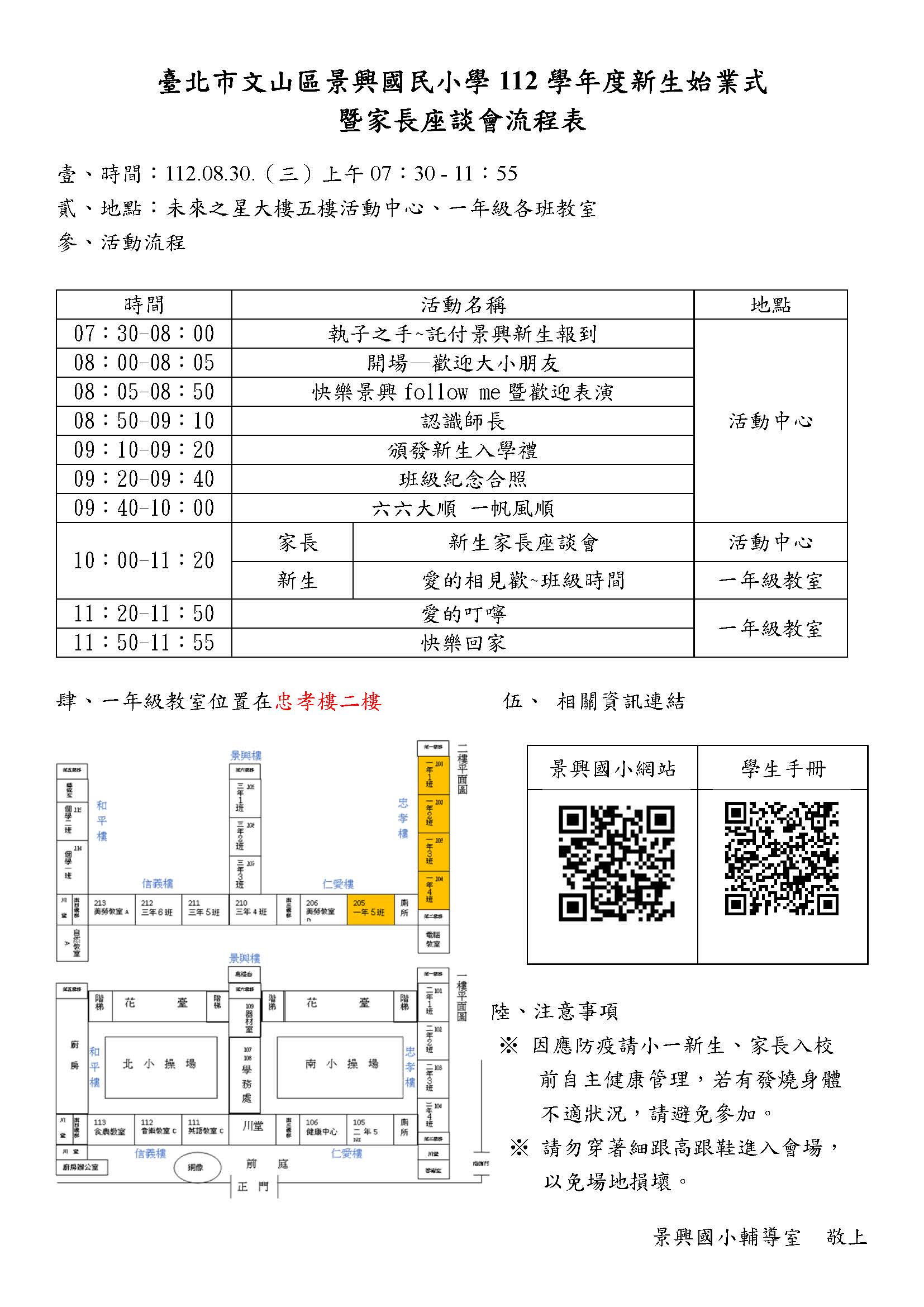 臺北市文山區景興國民小學112學年度新生始業式暨家長座談會