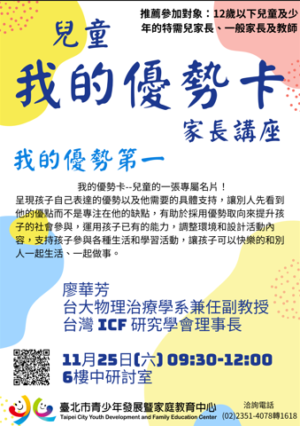 「我的優勢第一!」協助家長看見兒童的優勢, 運用兒童優勢參與學習和生活,臺北市青少年發展暨家庭教育中心11月25日上午舉辦兒童「我的優勢卡」家長 講座,歡迎報名參加,詳情可上網查詢。https://ydfe.gov.taipei/News_Content.aspx?n=BA4463FD2E3FC672&sms=F95A703B015E9DA2&s=31A7E278F70A3849
