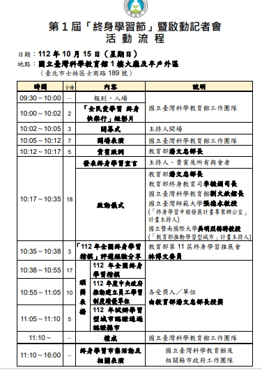 為強化國人對於終身學習之認知及行動力,以達110年3月 發布「學習社會白皮書」之「全民愛學習的臺灣-學習型 臺灣」願景逐步實現,教育部謹訂於112年10月15日(星期 日)上午10時至下午4時於國立科學教育館1樓大廳及半戶 外區舉辦「第1屆『終身學習節』暨啟動記者會」,除呈現 串聯各地方政府於112年10至12月舉辦具民眾參與性質之終 身學習活動之宣傳外,並規劃進行啟動儀式、發表終身學 習宣言、頒獎表揚以及終身學習市集活動與相關表演等。請踴躍參與!