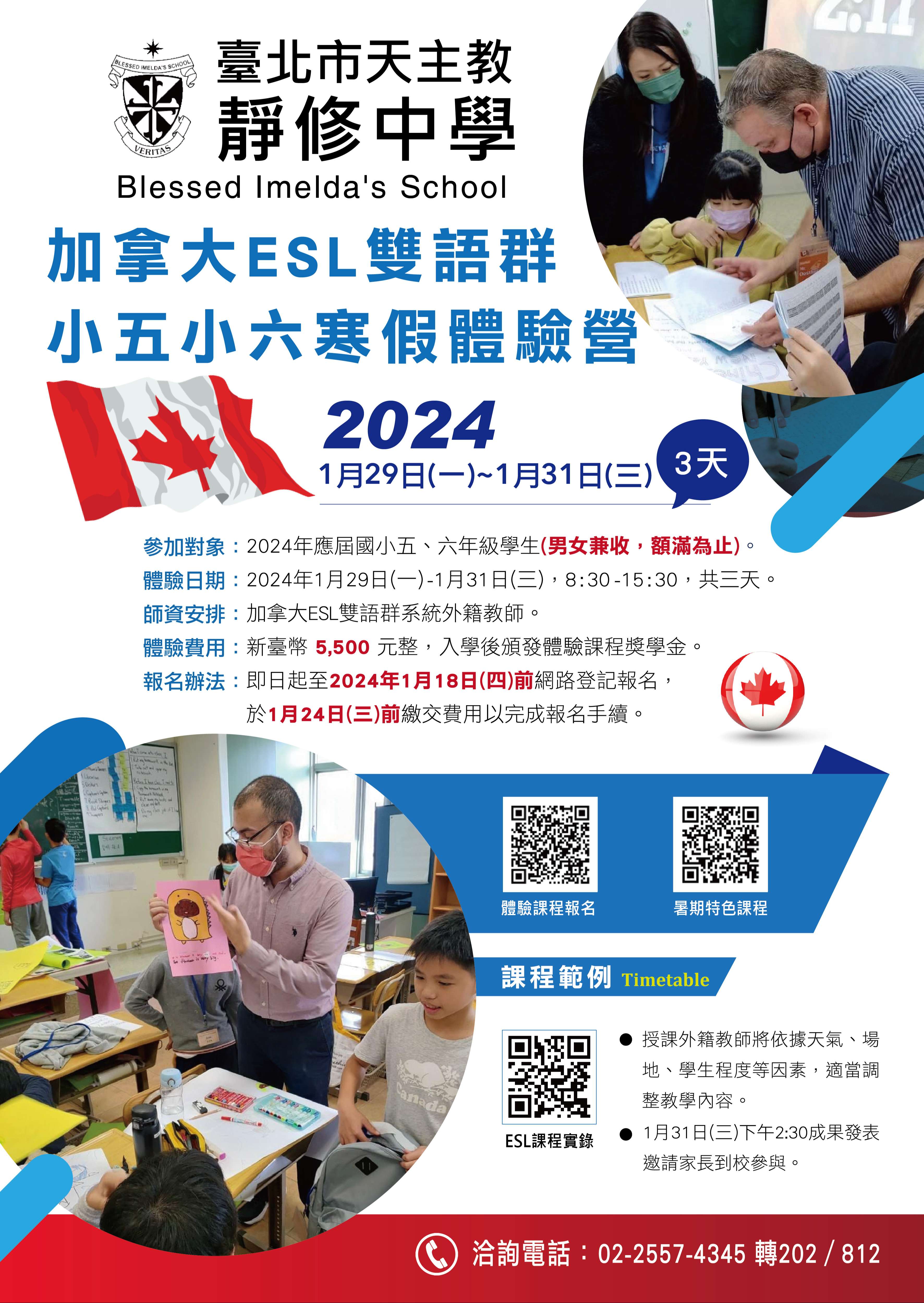 (二) 六年級加拿大ESL雙語課程體驗(限80人,額滿為止)課 程體驗時間:112年12月09日(六)上午9:20-11:20
