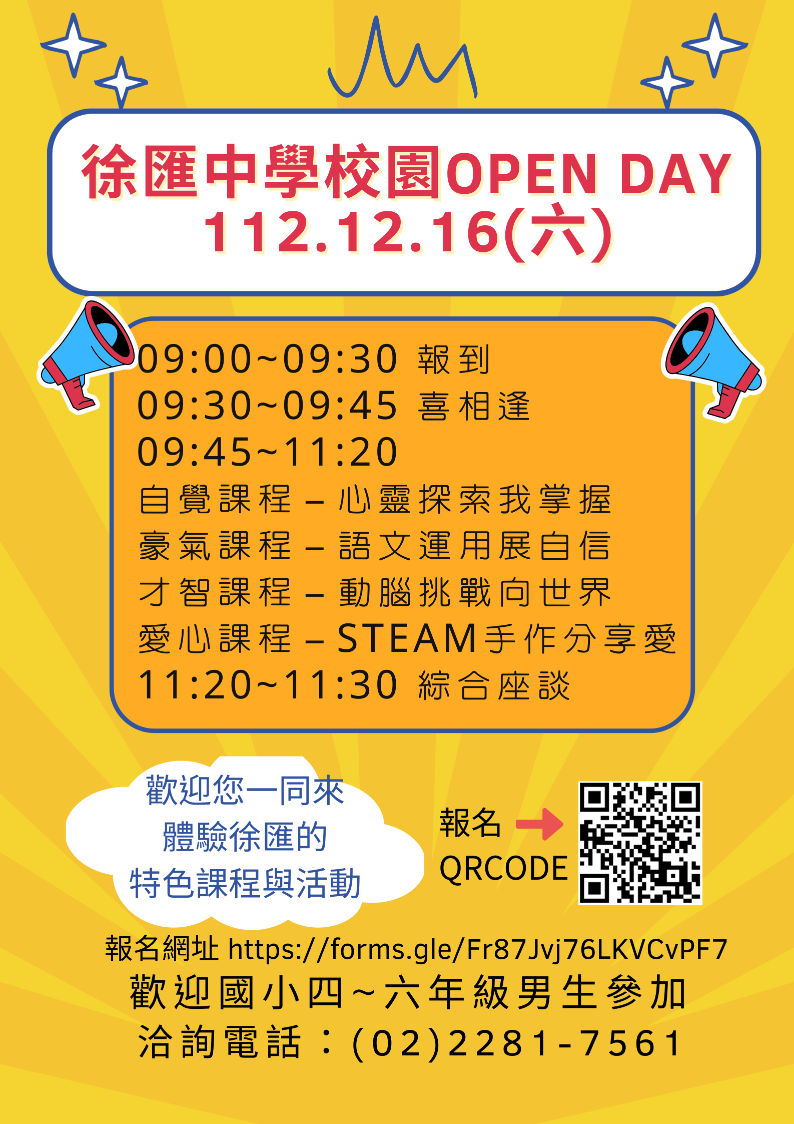 一、本校著重培育學生具備自覺、才智、愛心、豪氣四大能 力,歡迎國小學生參加本校辦理之「徐匯OPEN DAY」,親 自體驗本校特色課程及特色活動。