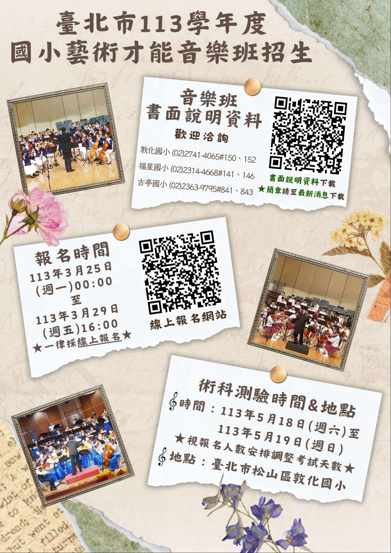 二、報名時間及方式:113年3月25日(星期一)00:00起至3月 29日(星期五)16:00止,於本市國中小藝才班鑑定報名 系統報名。