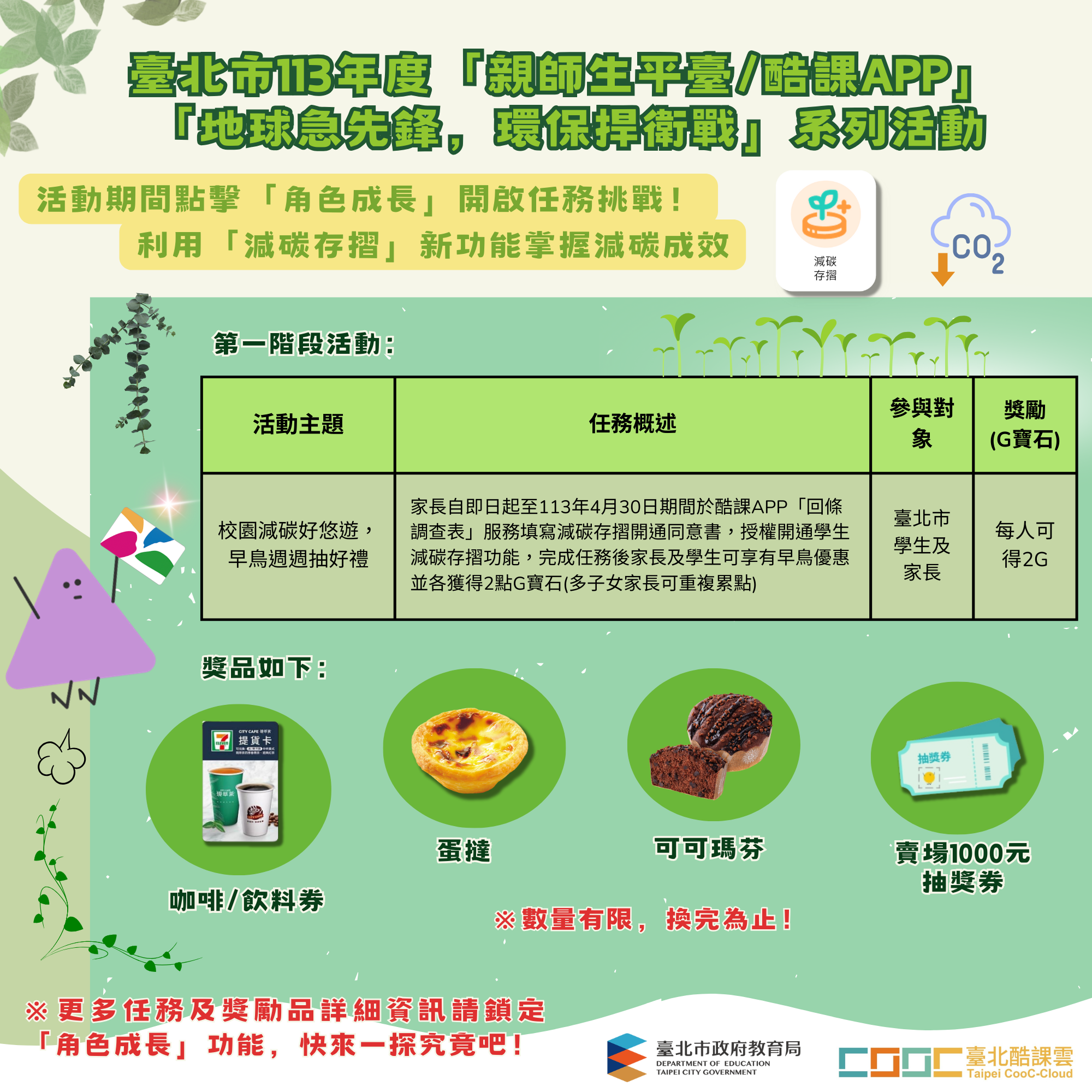教育局辦理酷課APP「地球急先鋒,環保捍衛戰」系列活動,有機會獲得G寶石兌換獎品喔,鼓勵家長、學生踴躍參加!