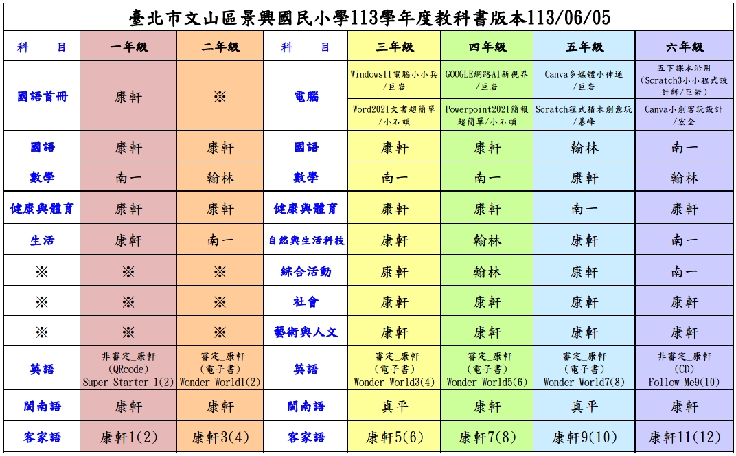 說明:經本校113年6月5日課發會通過之「113學年度臺北市文山區景興國民小學教科書版本」。