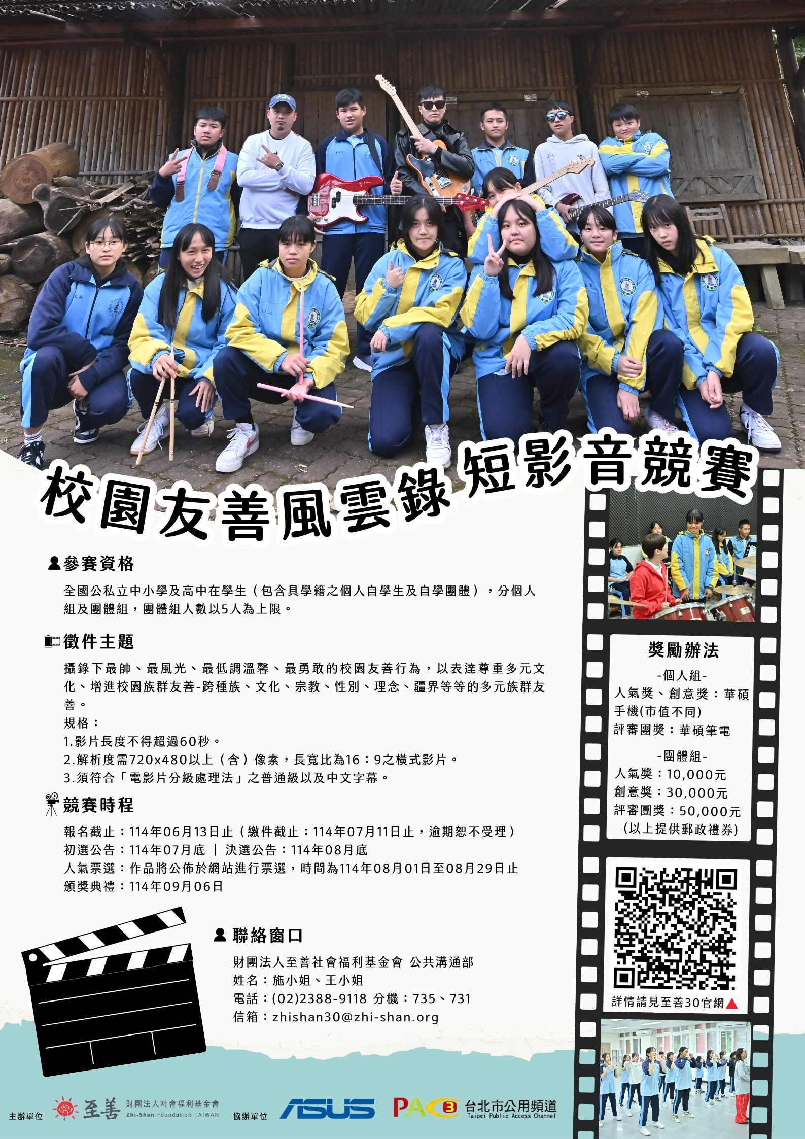 財團法人至善社會福利基金會(官網:https://www.zhi-shan.org/)長期從事亞洲4地兒少發展工作,為響應「兒童權利公約」(CRC)中禁止歧視原則,自2023年起倡議「校園族群友善」,已連續兩年舉辦校園族群友善獎。該會將辦理「校園友善風 雲錄-短影音競賽」,邀請全國國小至高中學生共同參與,促進校園友善。相關活動及報名方式,請詳見附件。![]() |