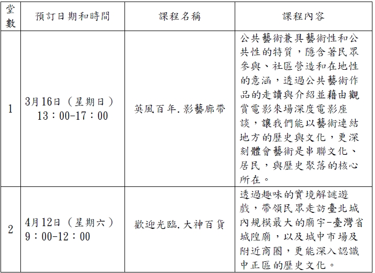 本課程結合本中正區公所114 年度基層藝文走讀活動。為拓展新住民視野,加速融入在臺灣的生活,鼓勵民眾認識臺北市中正區重要人文景點及瞭解在地建設發展,特開辦新住民電影欣賞走讀班,透過公共藝術作品的走讀與介紹並藉由觀賞電影來場深度電影座談,讓我們能以藝術連結地方的歷史與文化,讓新住民朋友探索臺北城豐富的文化底蘊,進而互相認識、互相交流學習,促進不同文化之間的交流。