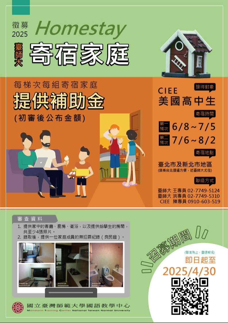 臺北市立大安高級工業職業學校協助國立臺灣師範大學國語教學中心辦理「接待家庭經驗分享暨2025年CIEE美國高中生寄宿家庭招募說明會」資訊,敬邀師長與有興趣的家長參與。
