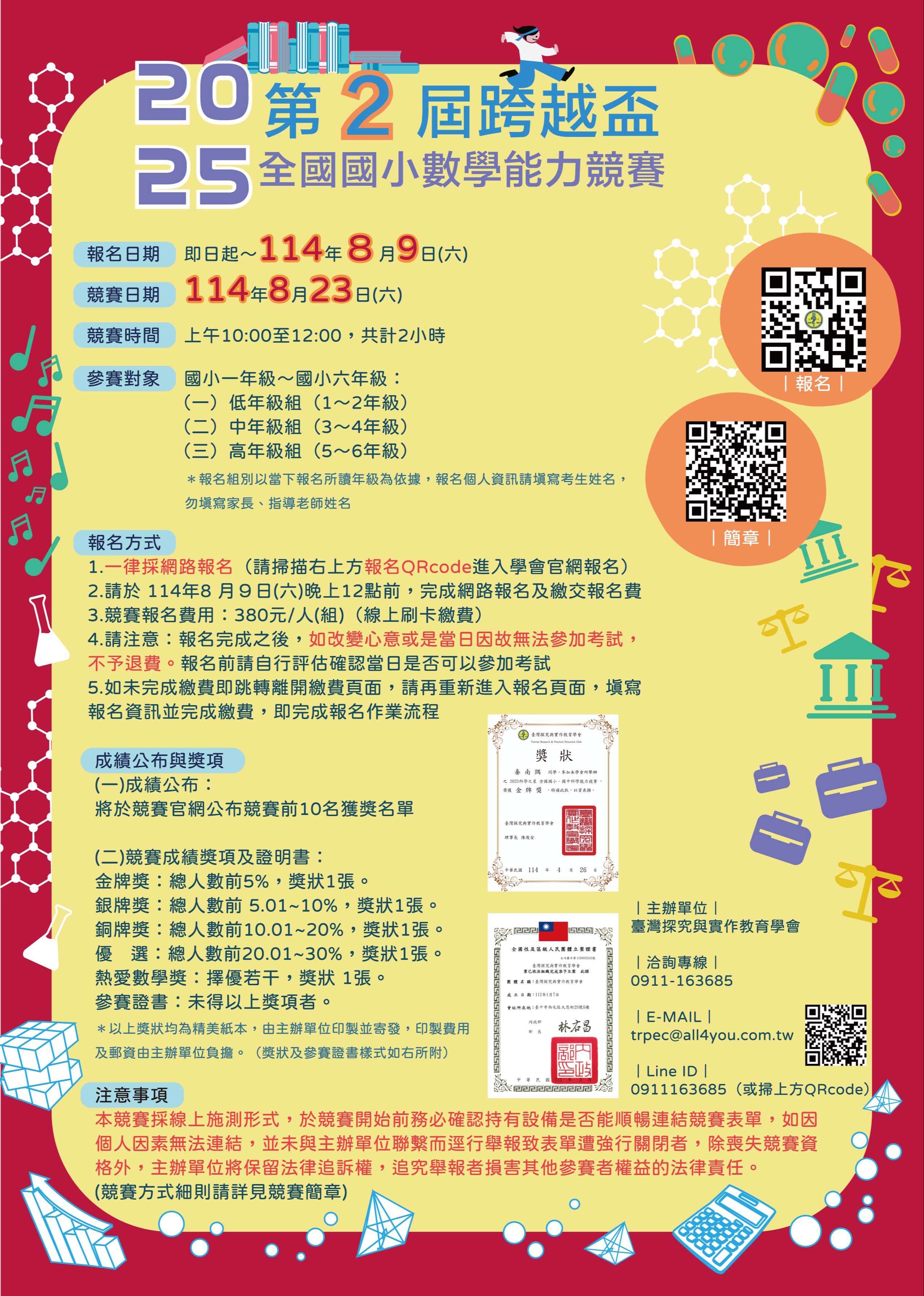 主旨:為鼓勵學生培養推理思考能力,本會舉辦「第2屆跨越盃 全國國小數學競賽」,敬請學校鼓勵學生報名參加。 說明: 一、參賽組別(1)國小1〜2年級(2) 國小3〜4年級(3)國小5〜6 年級 限額3000人 二、報名日期: 即日起~2025年8月9日(六) 三、競賽日期:114年8月23日(六)上午10:00~12:00。 四、比賽方式:線上競賽(須具備電腦及基本打字能力) 五、報名網址: https://trpec.com.tw/ 六、報名費用380元請於114年8月9日(六)晚上12點前,完成網 路報名及繳交報名費即得參賽資格。( 請注意:報名完成 之後,不予退費。報名前請自行評估確認。) 七、洽詢資訊:臺灣探究與實作教育學 lineID: 0911163685 電話:0911163685(週一~周五8:30~17:00) E-MAIL: trpec@all4you.com.tw
