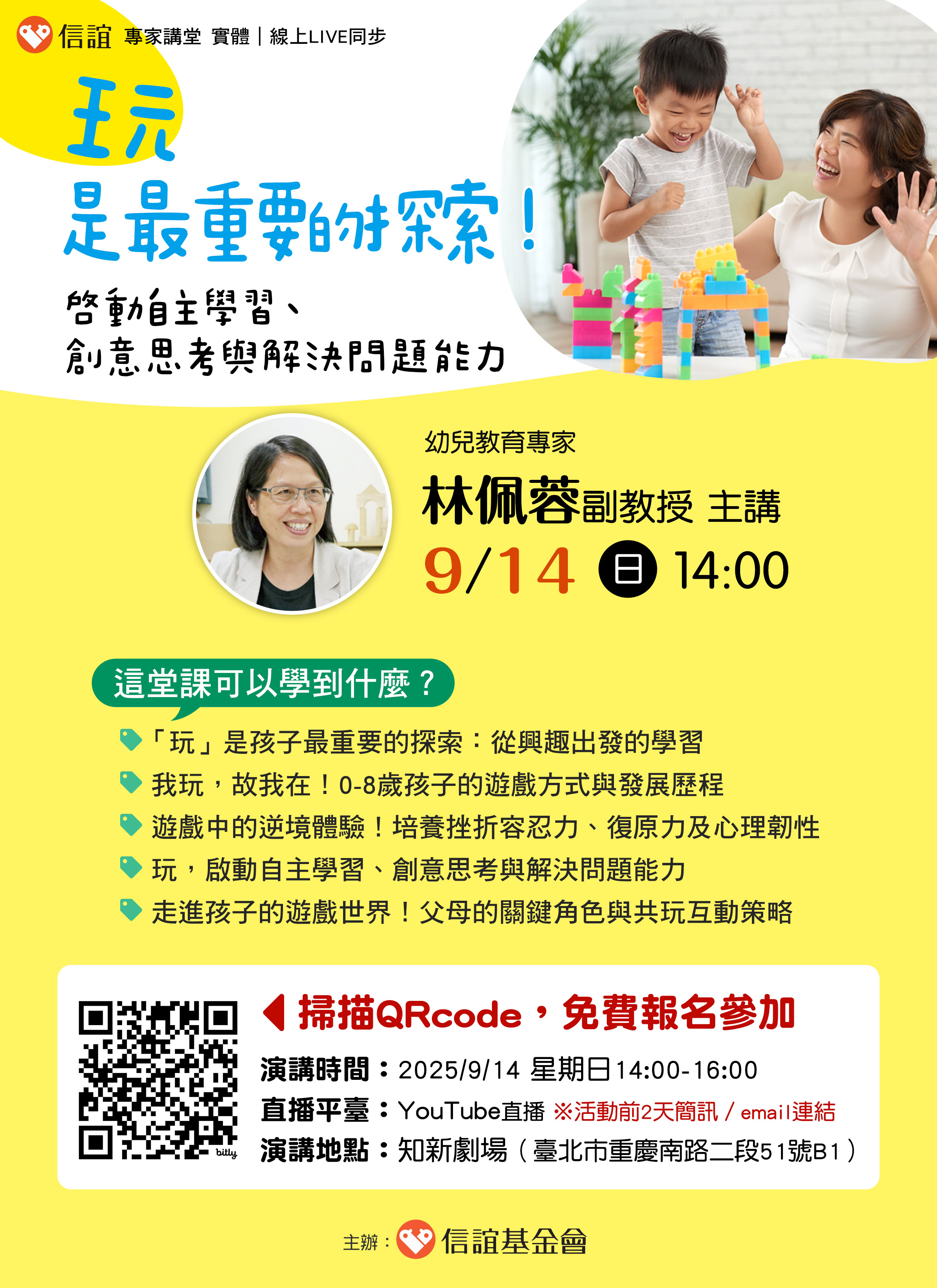 一、遊戲,為孩子打開探索的門,營造主動、有趣的學習氛 圍,更是培養心理韌性的練習場。為協助家長了解遊戲對 幼兒發展的重要性,信誼將於2025年9月14日(日)下午 2:00-4:00舉辦【「玩」是最重要的探索!啟動自主學 習、創意思考與解決問題能力】實體/線上LIVE 講座,邀 請家長免費報名參加。