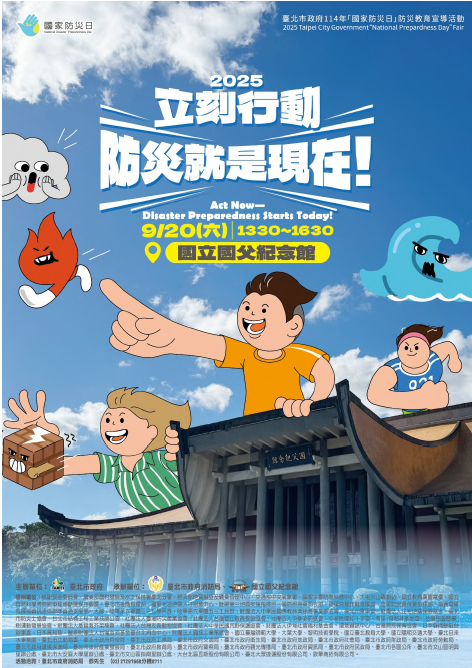 9月20日下午國父紀念館,國家防災日活動「立刻行動 防災就是現在!」,互動闖關學防災,防災手作樂趣多,歡迎您來挑戰成為防災達人!闖關集點就送精美禮品,全家大小一起樂防災!