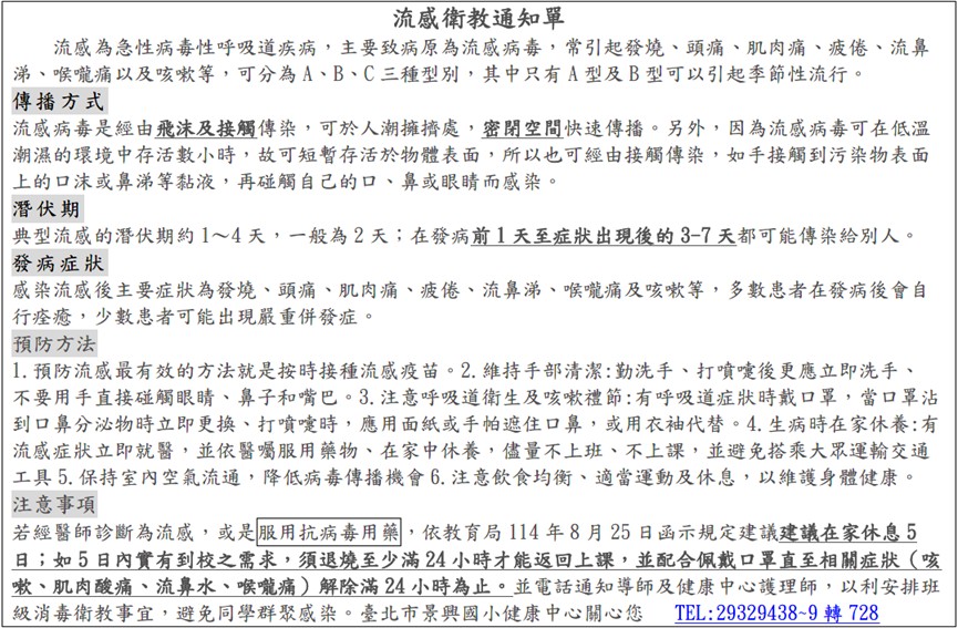 近來全台流感疫情持續升溫,校內流感確診個案亦有增加,請家長們留意孩童身體狀況,落實生病發燒不上學、就醫確診回報學校的原則,避免群聚感染,維持校內外良好衛生習慣,正確勤洗手,需要時戴上口罩,另提供流感衛教宣導單如后,敬請參閱,祝福大家都健康平安。 景興國小學務處114.9.26