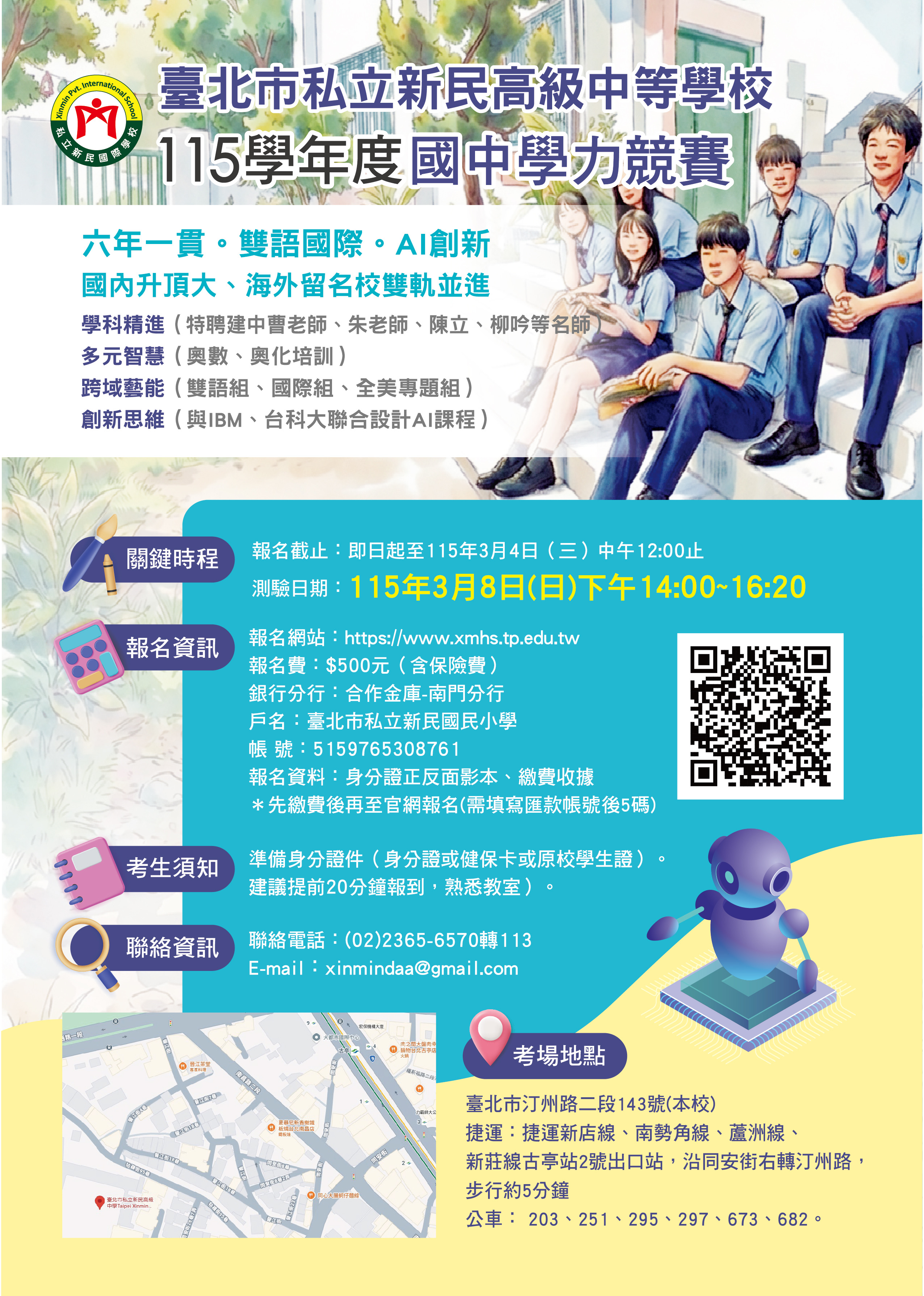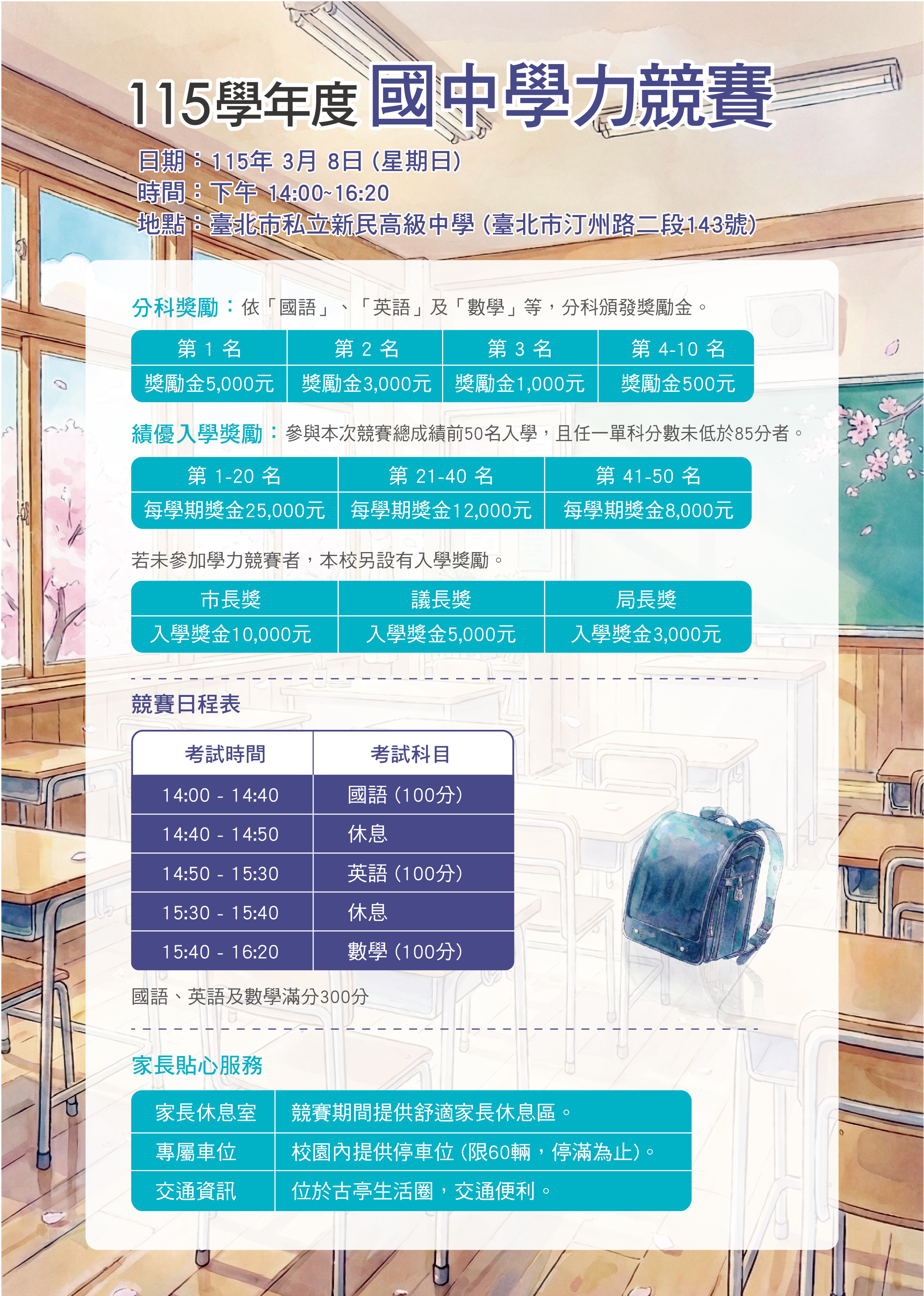 六、當天於本校同步辦理國中入學課程說明會,115年3月8日 (星期日)時間下午14:20~15:20。